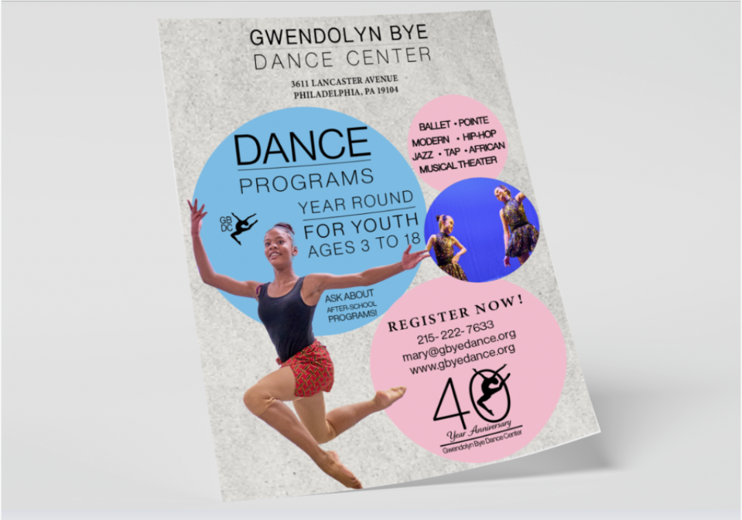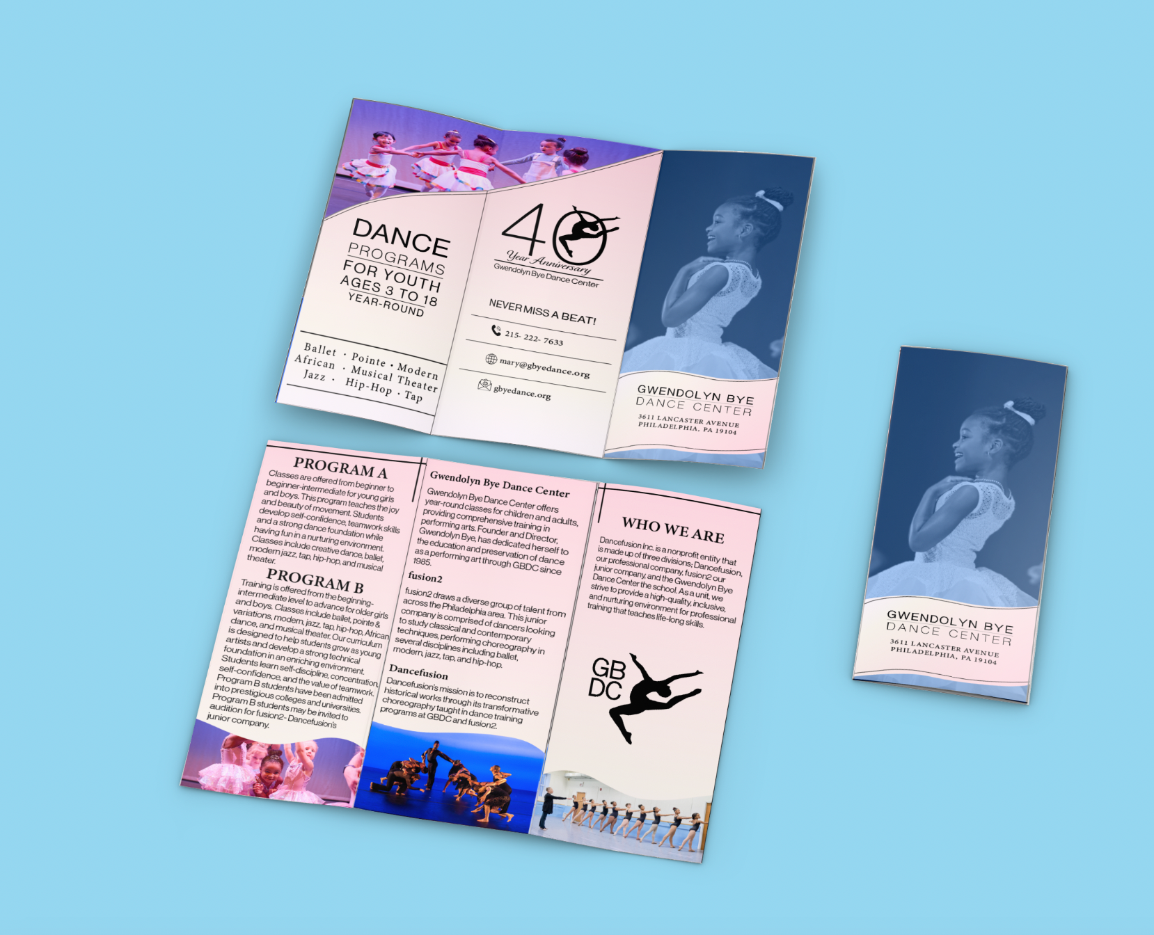 This campaign was designed to bring new energy to Gwendolyn Bye Dance Center’s fall enrollment while staying true to the brand’s design and legacy. By highlighting the diverse offerings and welcoming community, we aimed to target families and young dancers to take a leap and join a program that fosters both skill and passion. With new posters, brochures and social media posts, the campaign captured the energy of the dance company and Gwendolyn’s dedication to her students.